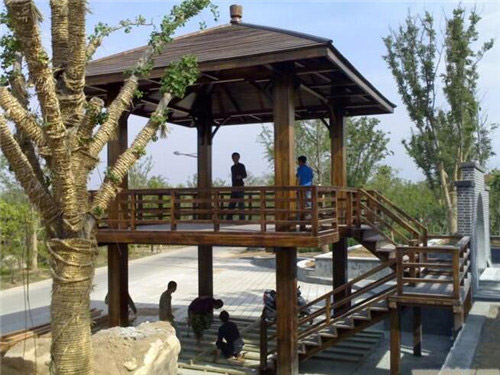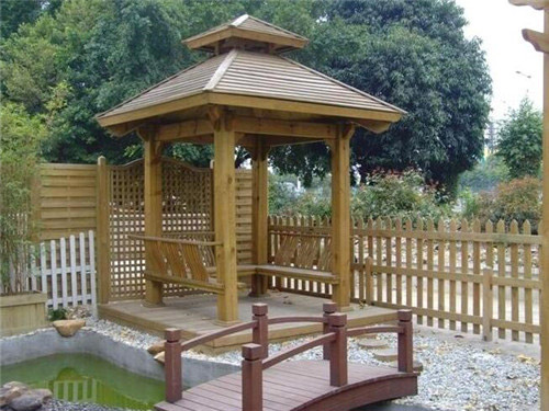 防腐木亭子具有體積不大、用料較少、設(shè)計靈活、建筑方便等特點,很適合園林景觀布局的需要。防腐木亭子是在我國園林景觀綠化中運用多的一種建筑形式。無倫是古典園林景觀,還是現(xiàn)代園林景觀中,都可以看到各種各樣豐富多彩的防腐木亭子,屹立于山岡之上;或依附在建筑之旁;或漂浮在水池之畔。以玲瓏美麗、豐富多樣的形象與園林景觀中的其他建筑、山水、綠化等相結(jié)合,構(gòu)成一幅幅生動的畫圖。貴州防腐木亭子成了為園林景觀空間和自然山水增添美色的重要點綴建筑物。防腐木亭子的作用一方面是點綴園林景觀空間、提升環(huán)境層次,另一方面是解決人們在旅游休閑中駐足休息,納涼避雨、眺望景色的需要。